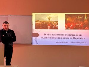 Викладач Євгеній Распопов провів для студентів лекцію на тему: «Небесна Сотня: ціна свободи та відповідальність поколінь». Під час зустрічі говорили про події Революції Гідності, силу громадянської позиції, мужність і жертовність тих, хто став символом нескореності українського народу.